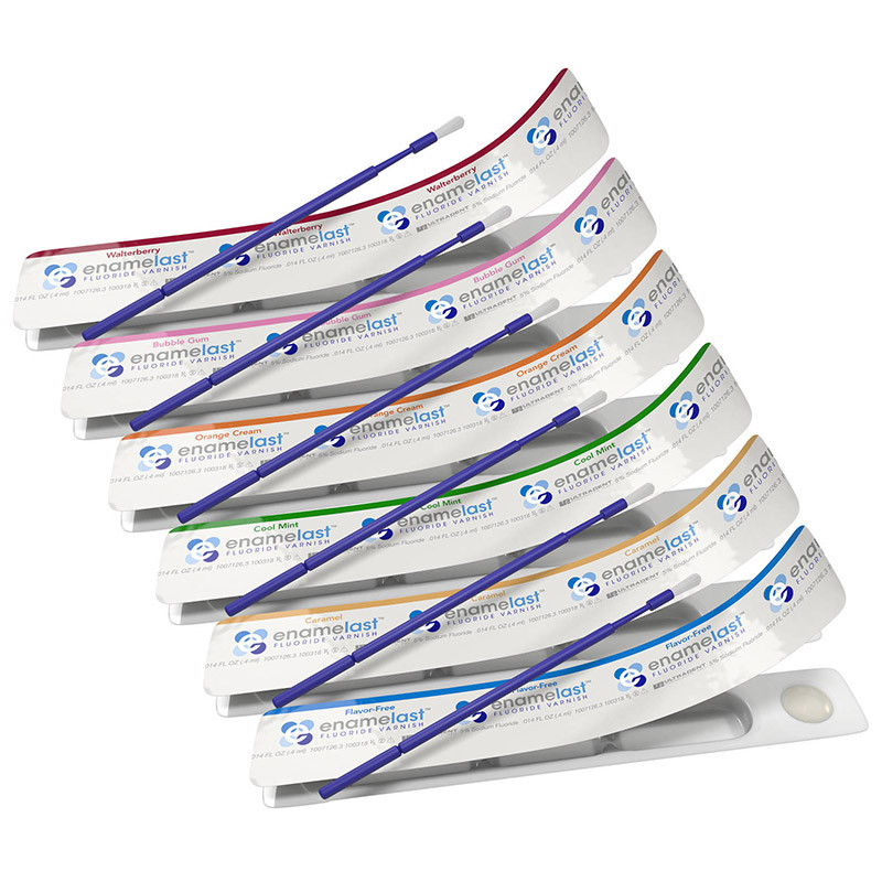 Enamelast is a flavored, xylitol-sweetened, 5% sodium fluoride in a resin carrier.